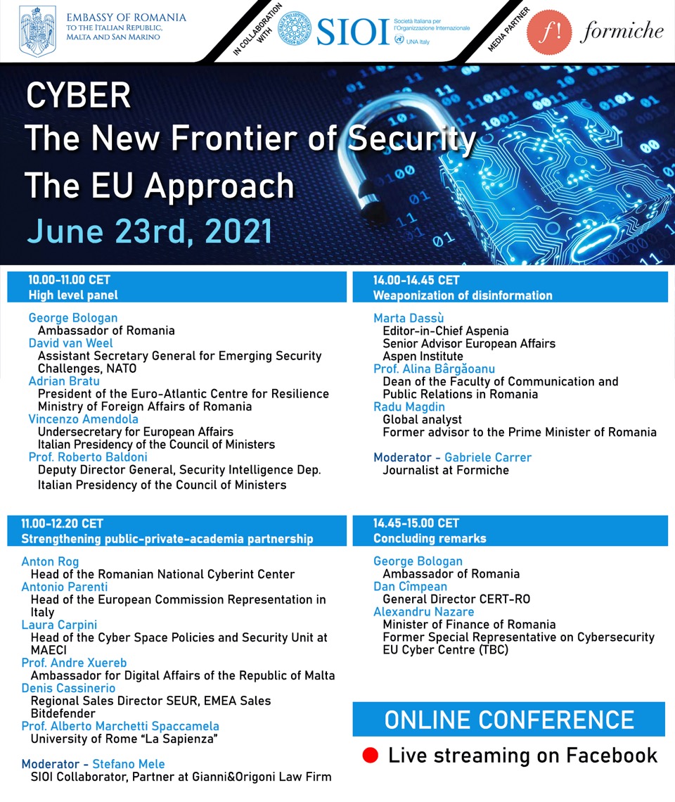 L’Ambasciata di Romania nella Repubblica Italiana, Malta e San Marino organizzano, il 23 giugno 2021, la conferenza ad alto livello ”Cyber – The New Frontier of Security. The EU Approach”. L’evento, organizzato in collaborazione con SIOI – Società Italiana per l’Organizzazione Internazionale, si svolgerà online in lingua inglese e sarà trasmesso in diretta sulla pagina ufficiale Facebook dell’Ambasciata, sulla homepage di Formiche.net e sui canali social di Formiche.