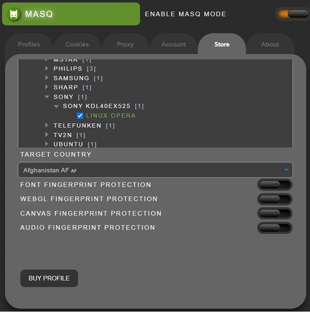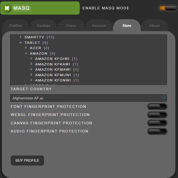 MASQ provides a broad collection of authentic device fingerprints provided via integrated marketplace. The tool is available for $130 and each new device fingerprint starts from $1. The marketplace includes over 70 fingerprints divided into 6 categories ranging from mobile devices, tablets to Smart TVs and gaming consoles including Sony Playstation, Xbox and Nintendo.